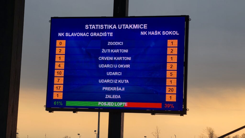22.3.2026. Gosti već u 4 minuti dolaze u vodstvo. Mi imamo prečku koju pogađa David, ali lopta ne ulazi u gol. Malo kasnije gosti imaju zicer 1 na 1, ali pucaju pokraj gola. Nakon toga David ponovno prolazi svoga čuvara, puca i pogađa stativu, a Dino odbijenu loptu umjesto u gol šalje visoko iznad gola. Pred kraj poluvremena Puška sa 5 metara glavom puca tik uz vratnicu. U 2. poluvremenu od 57. minute obje ekipe igraju sa igračem manje. Lovro je nesmotreno startao i za to dobio crveni karton, a gostujući igrač zbog napada na našeg igrača. Do kraja utakmice nije bilo ozbiljnijih prigoda za gol niti za jednu ekipu.